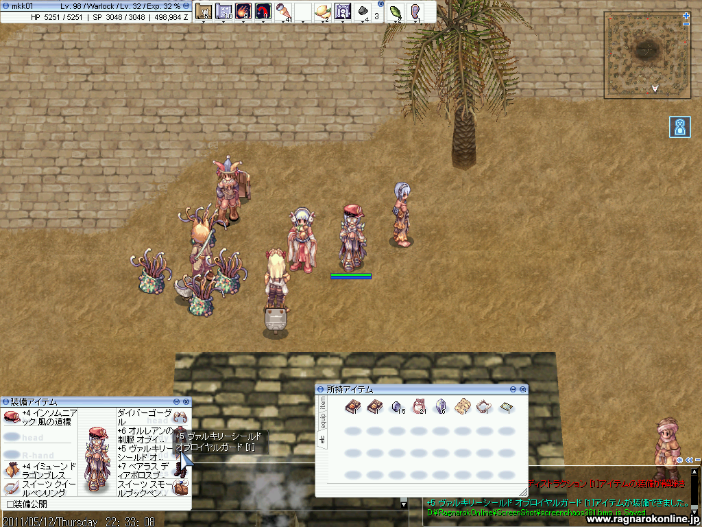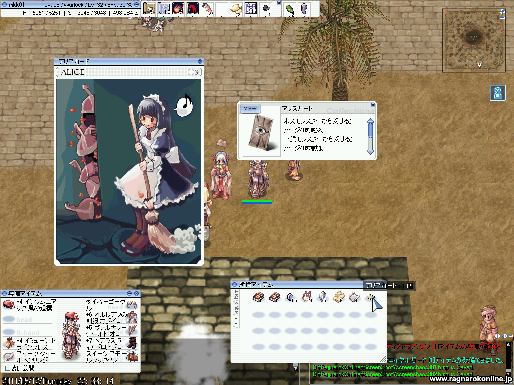 修羅とWLを作った。修羅はカルガ装備条件のBase100、WLはCrRと狩りに便利なの取ってJob32という目標たっせー。他にこれといってやりたい職もないし、しばらくはWLでアリス狩りかな。そして、金稼ぎ目的での外釣りやめた。安定した収入よりもギャンブルだよ。アリスアリス。