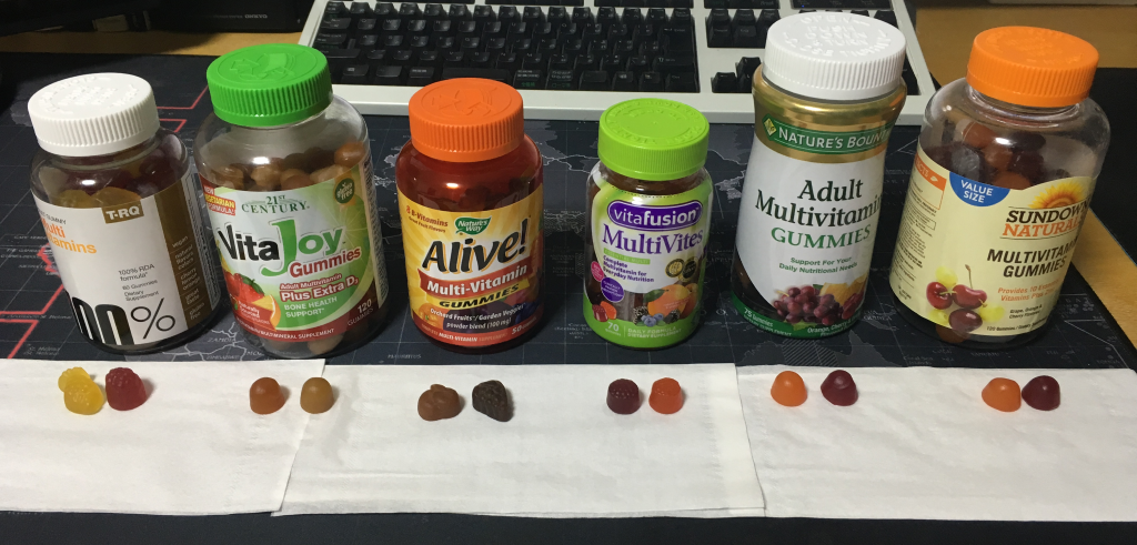 Sundown Naturals, Multivitamin Gummies: グミ。美味しい。あまり甘くはない。Nature's Bountyのと味も形も成分も違いが感じられない。 Nature's Bounty, Adult Multivitamin Gummies: グミ。美味しい。あまり甘くはない。Sundown Naturalsのと味も形も成分も違いが感じられない。 VitaFusion, MutiVites Complete Multivitamin: グミ。美味しい。甘い。成分的には上2つのグミに負けてる箇所もあるものの過剰摂取はなく上2つのグミだと少なめな物もバランス良く含まれてる。 Nature's Way Alive! Multi-Vitamin Gummies: チューイングキャンディ風食感。臭いが独特。 21st Century, VitaJoy Gummies: チューイングキャンディ風食感。すっぱい。 T-RQ Multi Vitamins: チューイングキャンディ風食感。すっぱい。