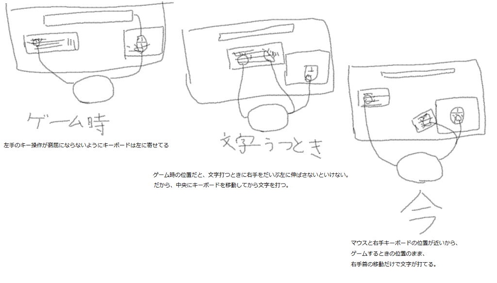 続き。左手はフルキーボードじゃないとファンクションキーとHOME付近のキーが使いにくいなぁ、ということで分離キーボードの左手用は倉庫にしまいまして左手だけフルキーボードにした。